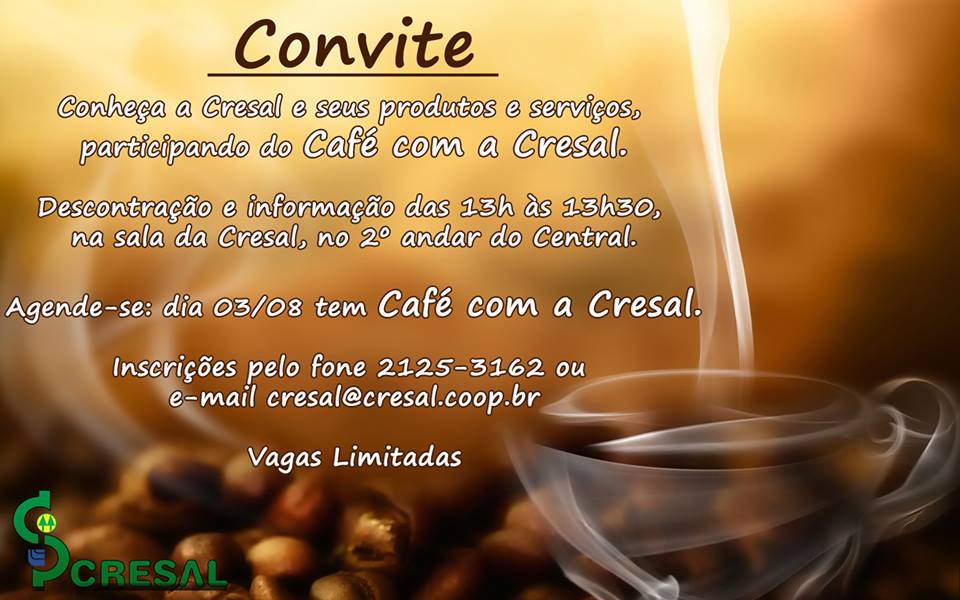 Teve continuidade nesta quinta-feira (03/08) o Café com a Cresal, na sala da Cooperativa, no intervalo do almoço, entre 13h e 13h30. O objetivo é a aproximação da Cooperativa com os cooperados e atrair novos associados.